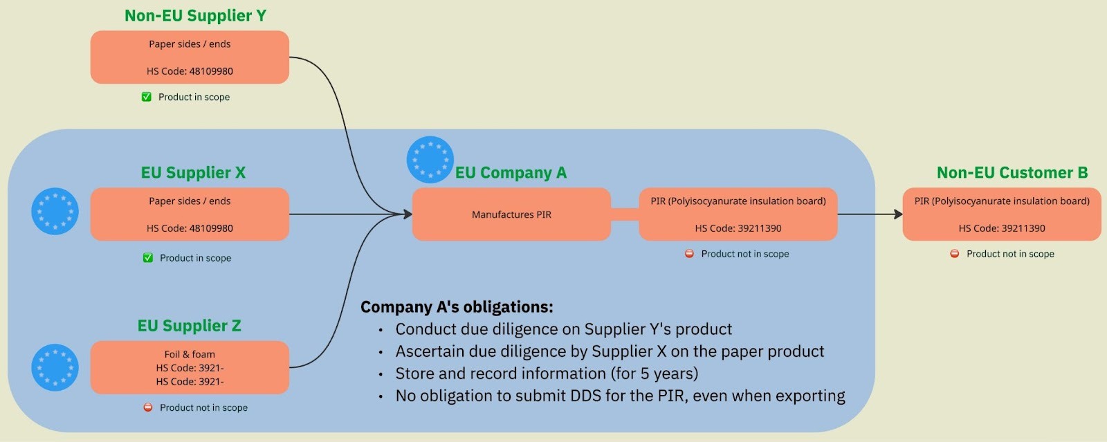 - Products not in scope (not listed in Annex 1), even if they use raw materials that are in scope. Example: PIR board.